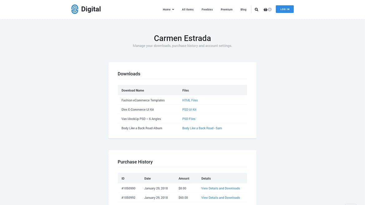 Digital Download Pro comes with a built-in Customer Dashboard template which allows the customers to check their downloads, purchase history, and account information easily. You need to create Customer Dashboard after installing the theme.